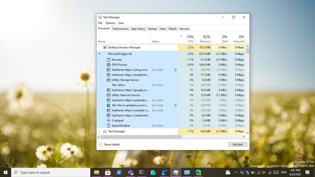 Task Manager has a new experimental feature in this build called “Eco mode” which provides users with an option to throttle process resources. It will also help identify apps that are already running in Eco mode. This feature is helpful when you notice an ap consuming high resources and would like to limit its consumption so that the system gives priority to other apps which will lead to faster foreground responsiveness and better energy efficiency.