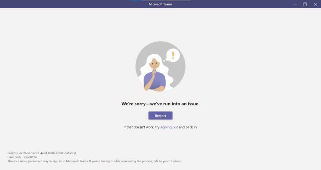 If you had MS Teams client installed on several PC especially on the personal one that you did not use for a while, you may encounter some issues when the next time you launch the MS Teams client. Especially when that PC was shared by multiple family member… (You have no idea what kind of software they’ll installed on it to cause trouble) In this post I’ll show you how to fix the issue when you cannot login MS Teams client with error “caa30194”.