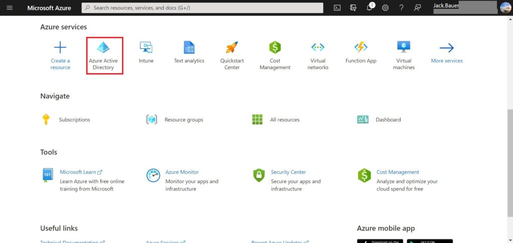 - Access Azure Portal from https://portal.azure.com, then go to Azure Active Directory.