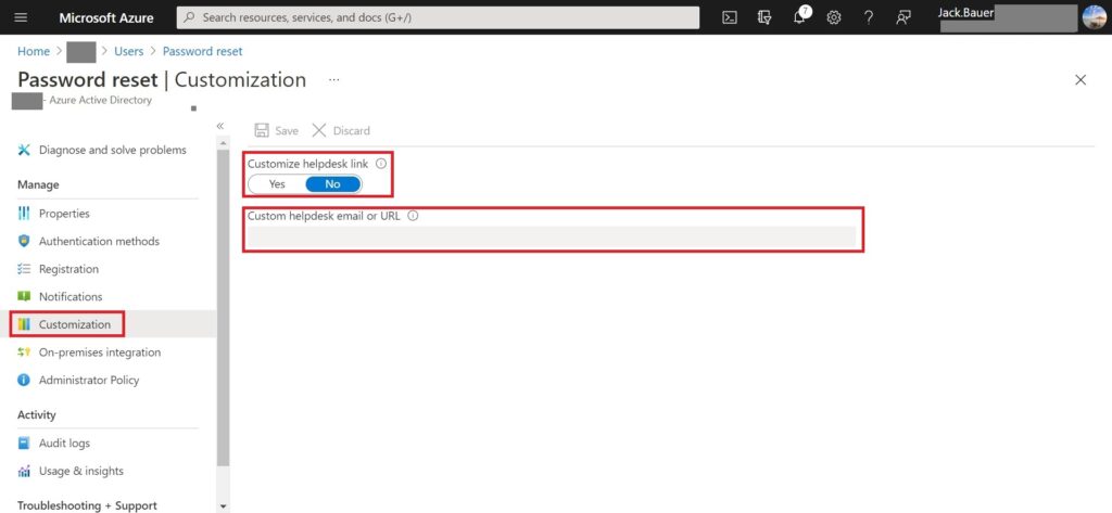 10. At the same blade of the previously blade, click “Customization” > select “Yes” for “Customize helpdesk link” > Paste your customized helpdesk email or URL under “Custom helpdesk email or URL” option > click “Save”. (In my case, remain default)