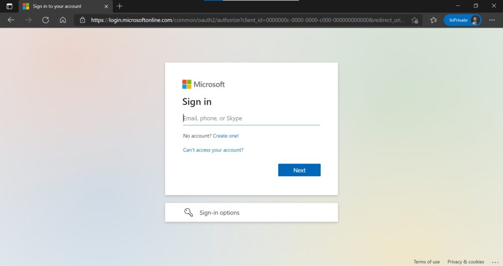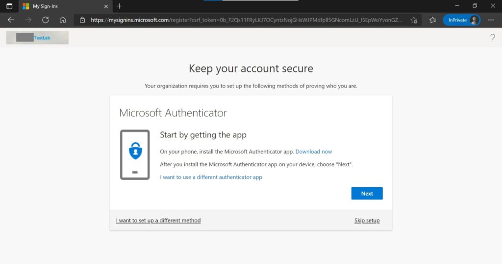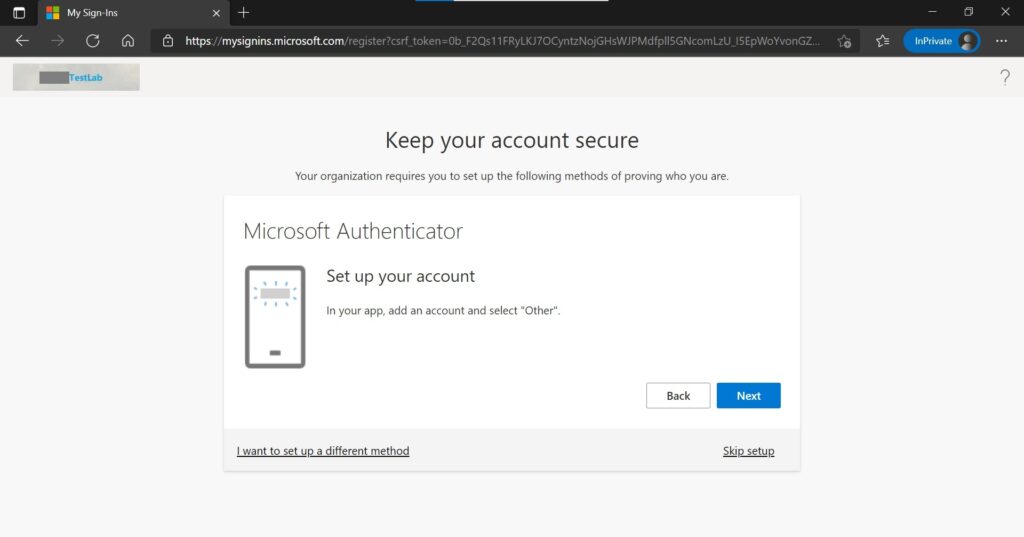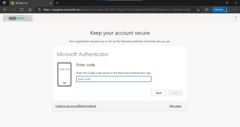 11. Try to access the SSPR link: https://aka.ms/ssprsetup via Microsoft Edge browser under InPrivate mode. (Sure, you can go whatever the web browser you had)