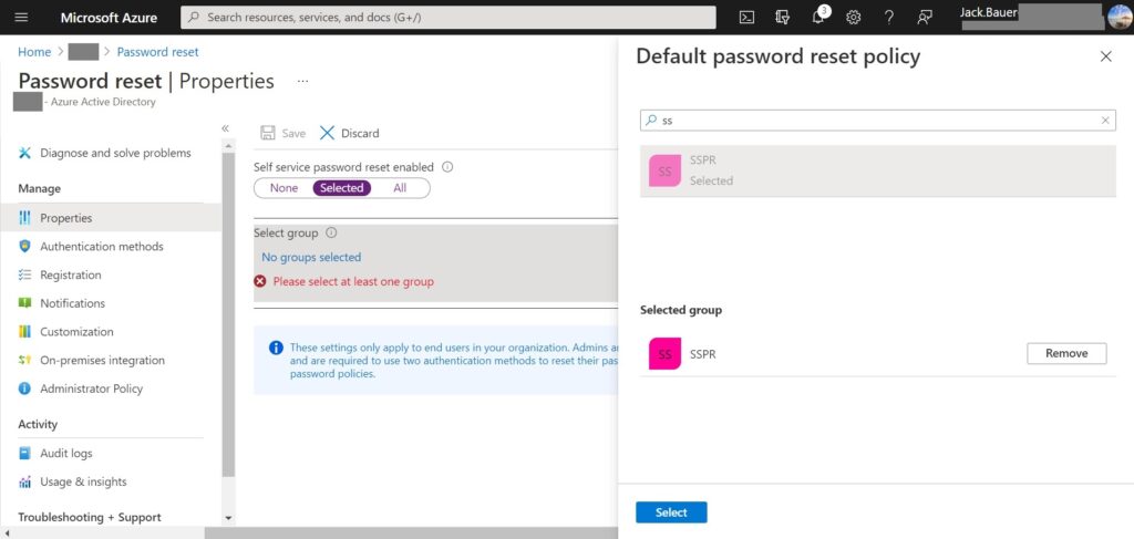 4. Choose “Selected” from the “Self service password reset enabled” option > then select your desired group from and hit “Select”. (in this tutorial I’ll go with “Selected” for my targeted SSRP group)