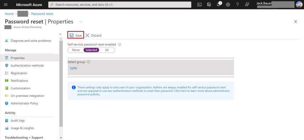 Be noted here, that regarding the “Authentication methods” and “Registration” options are only apply to end users in your organization. Admins account are always enabled for self-service password reset and are required to use two authentication methods to reset their password. You may refer to this link for the details of password policies and account restriction in Azure AD. Self-service password reset policies – Azure Active Directory | Microsoft Docs