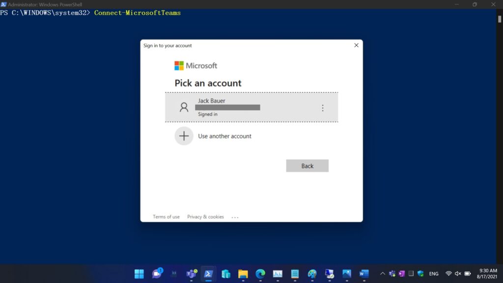 4. Enter “Connect-MicrosoftTeams” cmdlet and press enter. After you saw a login windows pop up, enter the Azure AD account with Teams Communication Administrator or Teams Service Administrator role assigned.