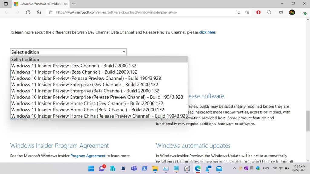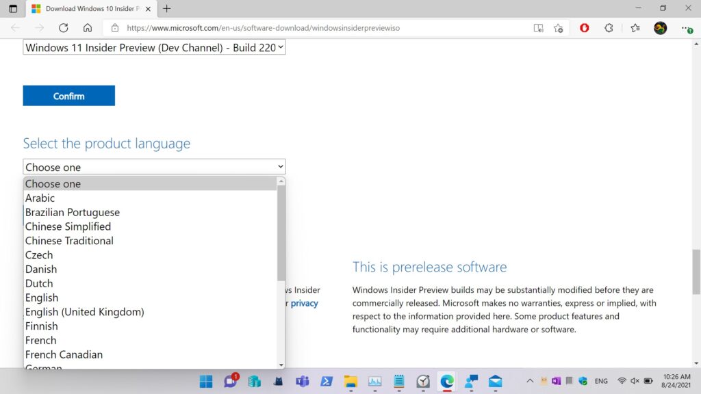 3. Scroll down the page and select the Windows 11 edition with either Dev or Beta channel then click “Confirm”.