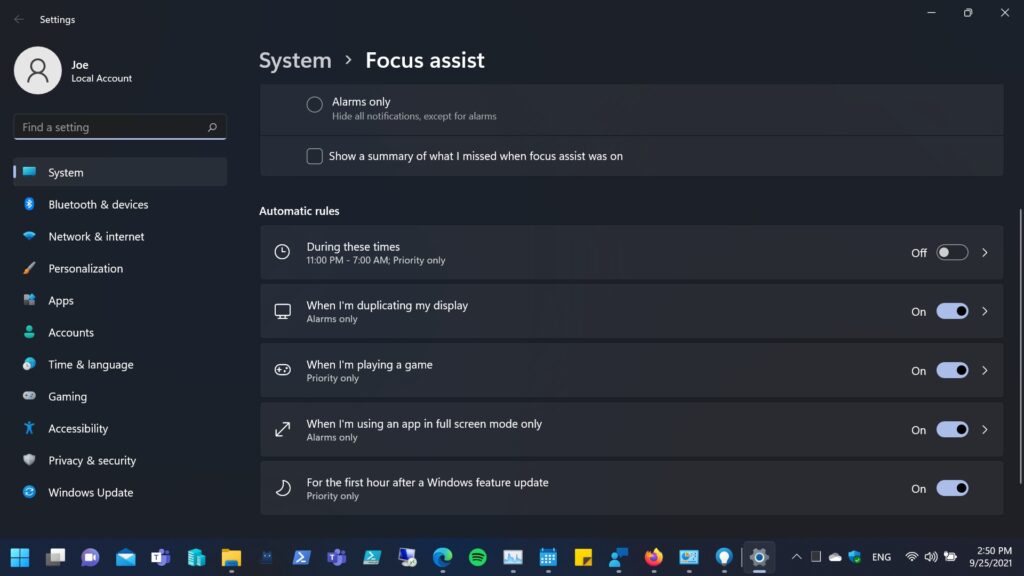 - Added an option to Focus Assist settings so you can choose whether or not you would like Focus Assist to be automatically enabled for the first hour after a Windows feature update.