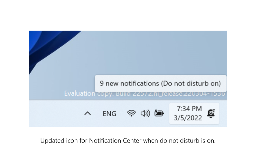 - Building off the Focus changes announced in Build 22557, updated the icon for Notification Center when do not disturb is set to on.