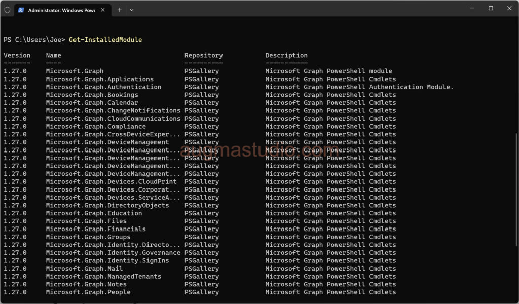 After the installation is completed, you can verify the installation by enter “Get-InstalledModule Microsoft.Graph”.