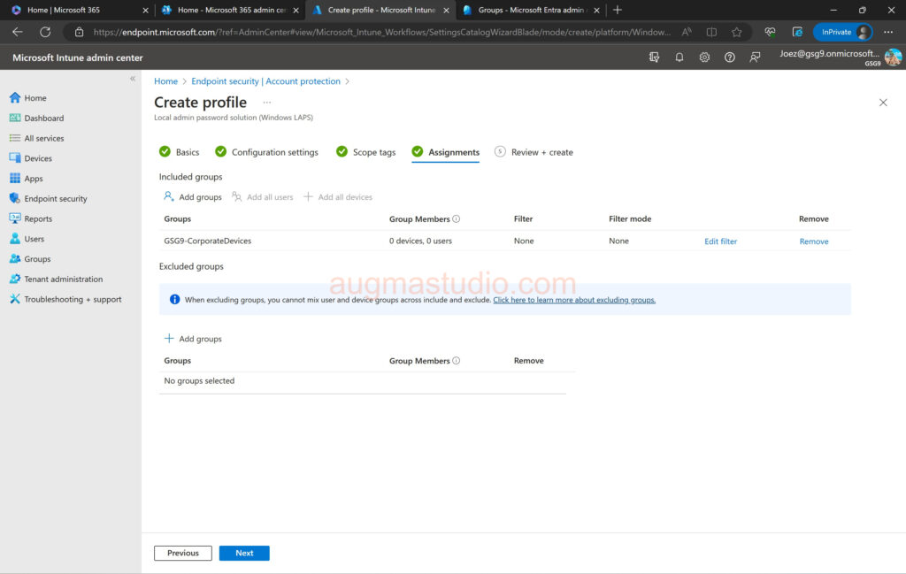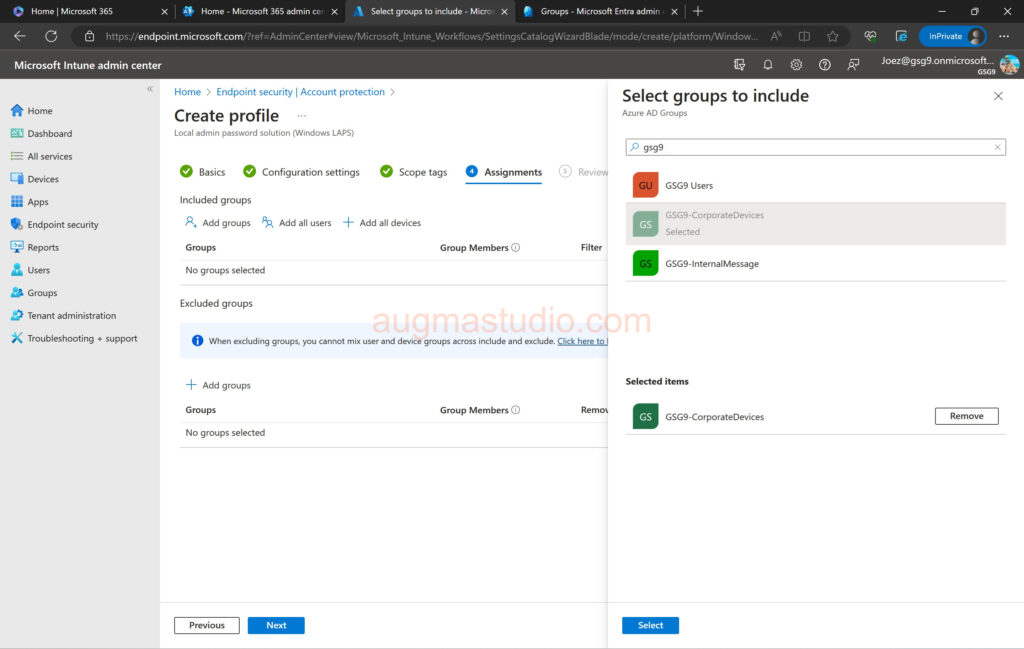9.Assign the profile to desired group by click “Add groups” > select desired group > click Select > click Next. As mentioned above it is better to assign to device group instead of user group.