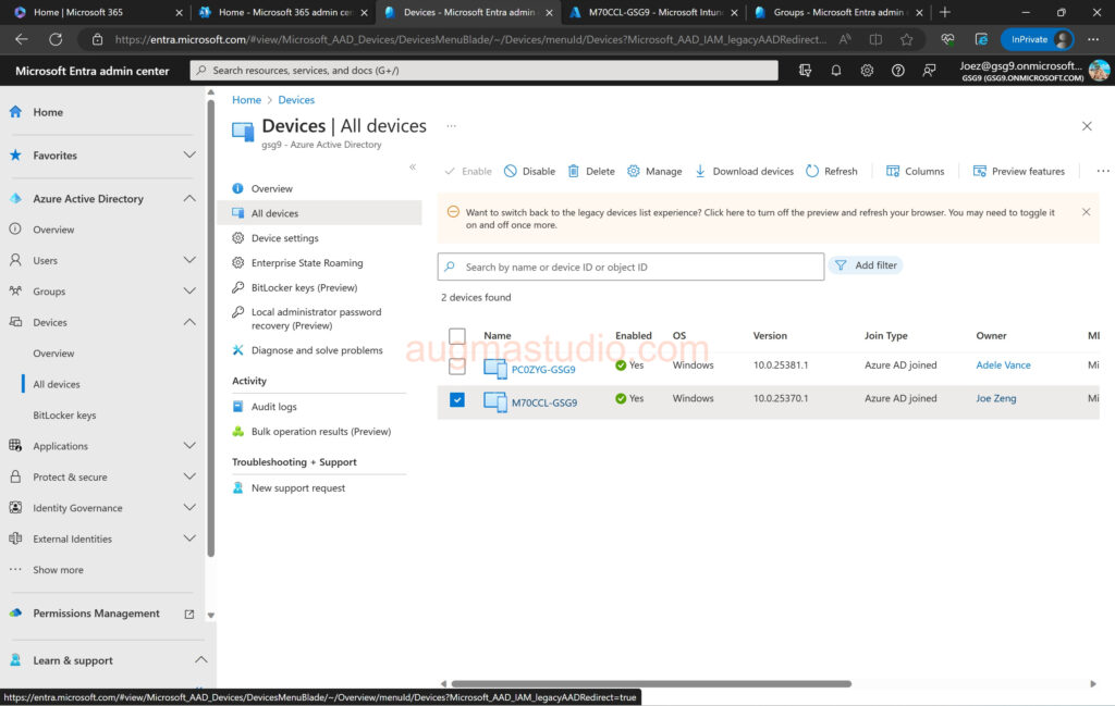 1.Sign-in to Microsoft Entra admin center (https://entra.microsoft.com) or Azure Portal(https://portal.azure.com) with your account (must be assigned with Cloud Device Administrator / Global Administrator).