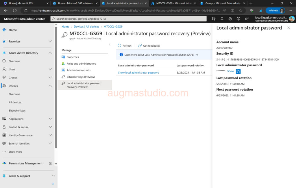 2.Or you can login to Intune admin center > Devices > All devices > select targeted device > Local admin password > Show local administrator password > show.