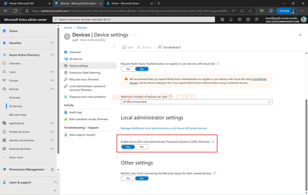 2.Navigate to Azure Active Directory > All devices > Device settings > select “Yes” under “Enable Azure AD Local Administrator Password Solution (LAPS) (Preview)”.