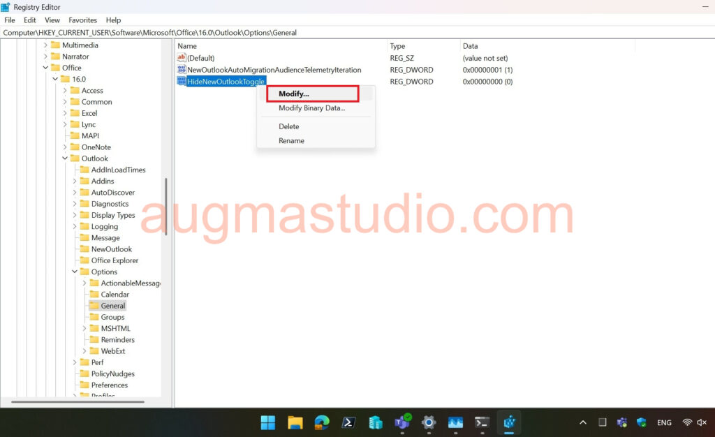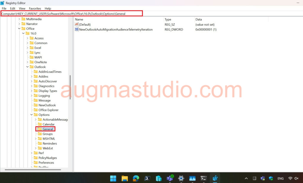 3. Navigate to “HKCU\Software\Microsoft\Office\16.0\Outlook\Options\General” within Registry Editor.