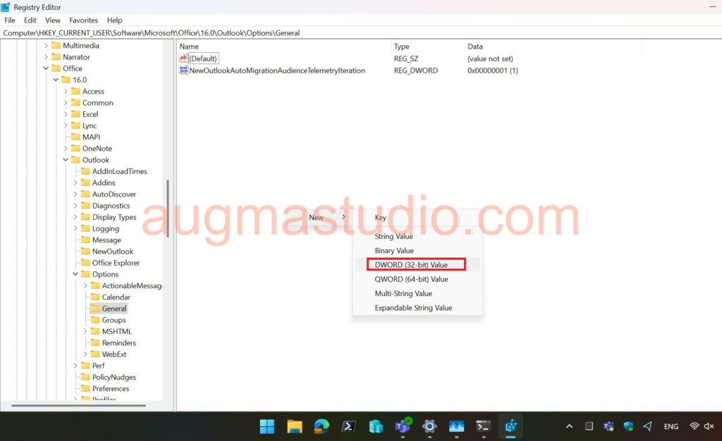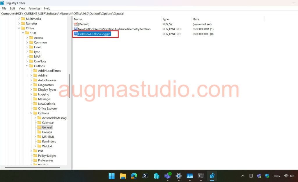 4. Right-click under current path > select “DWORD (32-bit) value” > naming “HideNewOutlookToggle”.